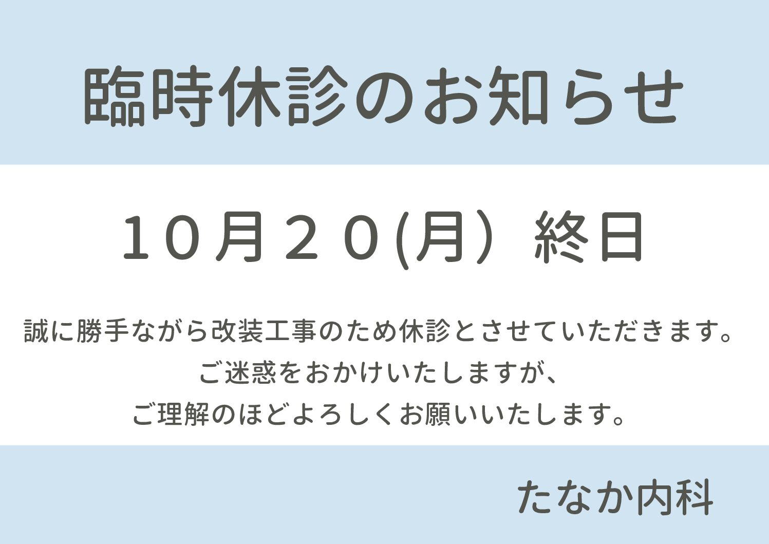 10/20 内科休診のお知らせ 2025.09.25 10月20日(月)は引っ越しのため内科部門休診となります。 内科部門の改装工事が終了し10/21(火)より本院での診療を再開いたします。 それまでの間、皆様にはご不便をおかけいたしますが、ご理解とご協力のほどよろしくお願いいたします。 Tweet Share Hatena Pin it エンビロン製品価格改定のお知らせ 前の記事 インフルエンザ予防接種のご案内 次の記事